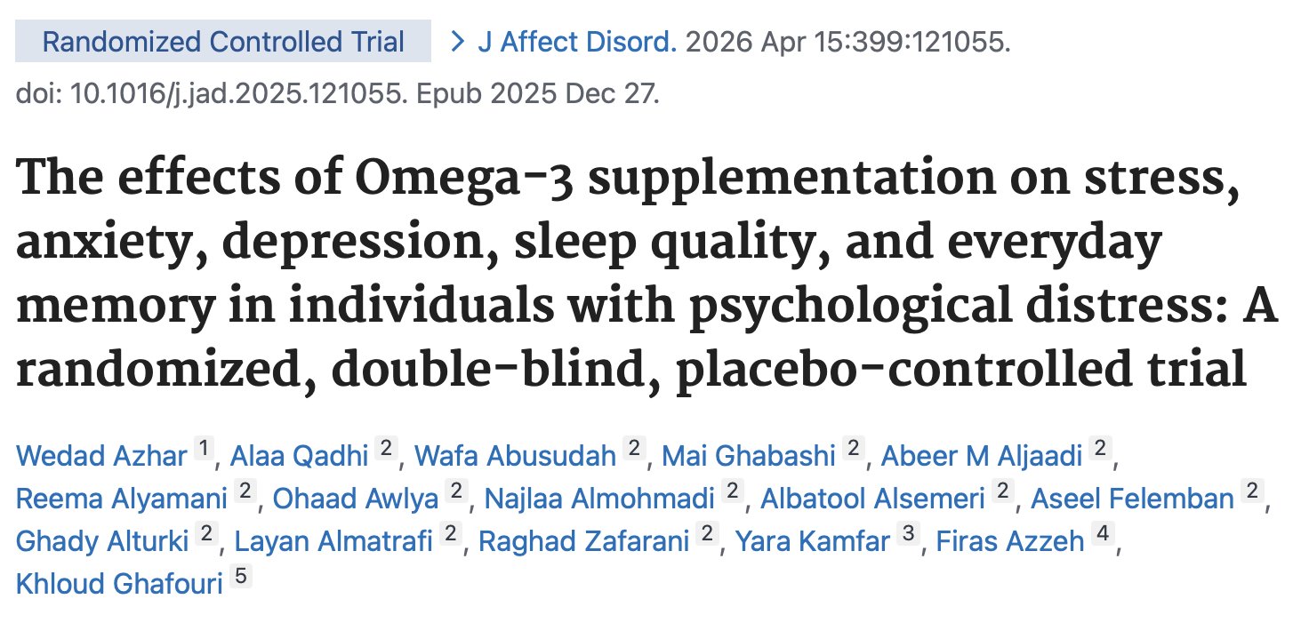 A new randomized, double-blind trial found that taking omega-3s daily for 3 months significantly improved stress, anxiety, depression, sleep quality, and everyday memory in adults with severe psychological distress.Mar 09 · x.com